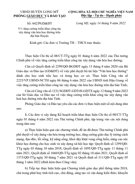 Trường TH Vĩnh Thuận Đông 2 gửi thông báo tăng cường triển khai công tác xây dựng văn hóa học đường trên địa bàn huyện.